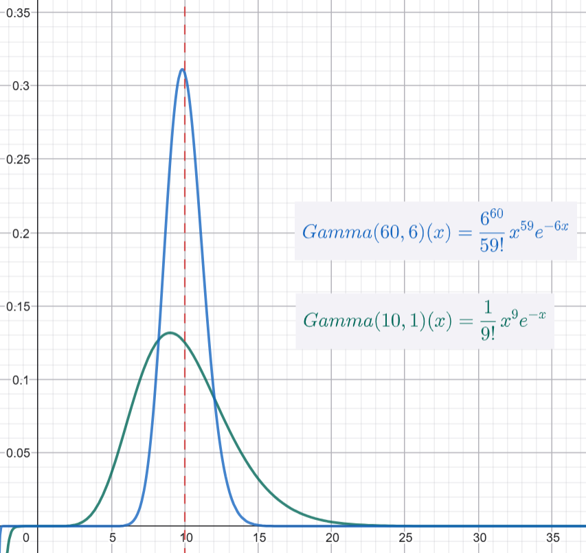 在這個例子中,你的平均估計沒有變,因為你的觀測數據 (50/5 = 10) 剛好符合你的猜測!但是,你的信心大大增加了(Gamma(60, 6) 是一個比 Gamma(10, 1) 更尖、更窄的分佈),因為你的信念現在是基於 6 個小時的數據,而不僅僅是 1 個小時的猜測。