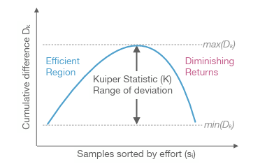 〔先講一個錯誤版本〕 假設題目的難度標記從 1 分到 100分,那我們花的時間,預計也要跟它呈正比。例如在難度1分的題目上若花 1分鐘,在難度100分的題目就是花 100分鐘。(假設這個難度量表有設計好)。那Kuiper Statistic其實很好理解,就是「多花的最長時間」加上「少花的最長時間」。比方說 agent 表現最差(最浪費時間) 是在難度3分的題目上花了10分鐘(超出預期7分鐘),然後太快放棄的是在難度70分的問題只花了 55分鐘(少花了15分鐘),那這個agent 的K value就是 7 + 15 = 22。